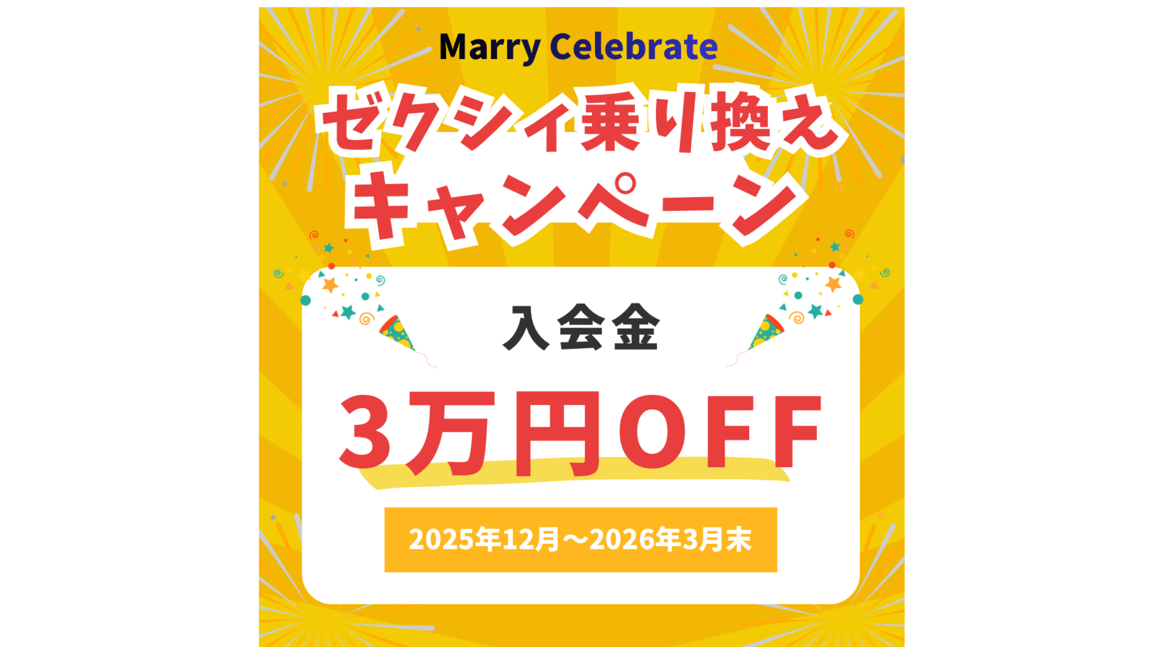 現在そちらをご利用中の方限定で、Marry Celebrateでは1月以降のお乗り換えキャンペーンを実施いたします。